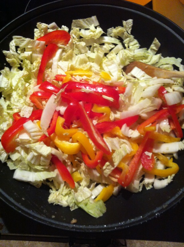Chinakohl und Paprika in Streifen schneiden. Ananas abtropfen lassen und Saft dabei auffangen. Knoblauchzehe zerdrücken und mit Ananassaft, Honig, Tomatenmark, Sambal Oelek und restlicher Stärke verquirlen.