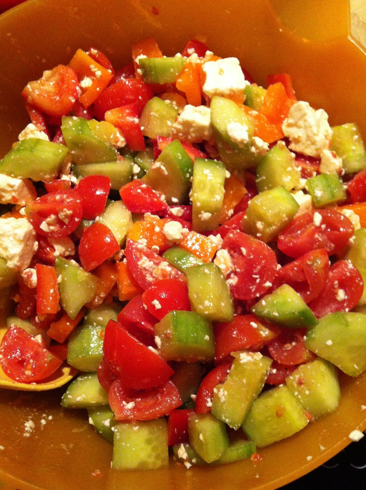 Die Gurke schälen und in Würfel schneiden, mit Salz bestreuen. Die Tomaten waschen und würfeln, die Paprika waschen, entkernen und ebenfalls würfeln. Alles zu den Gurken geben, dann den Fetakäse „zerrupfen“ (schneiden ist unnötig) und mit untermischen. Das Öl zugeben und anschließend mit Salz, Pfeffer und Zucker abschmecken.