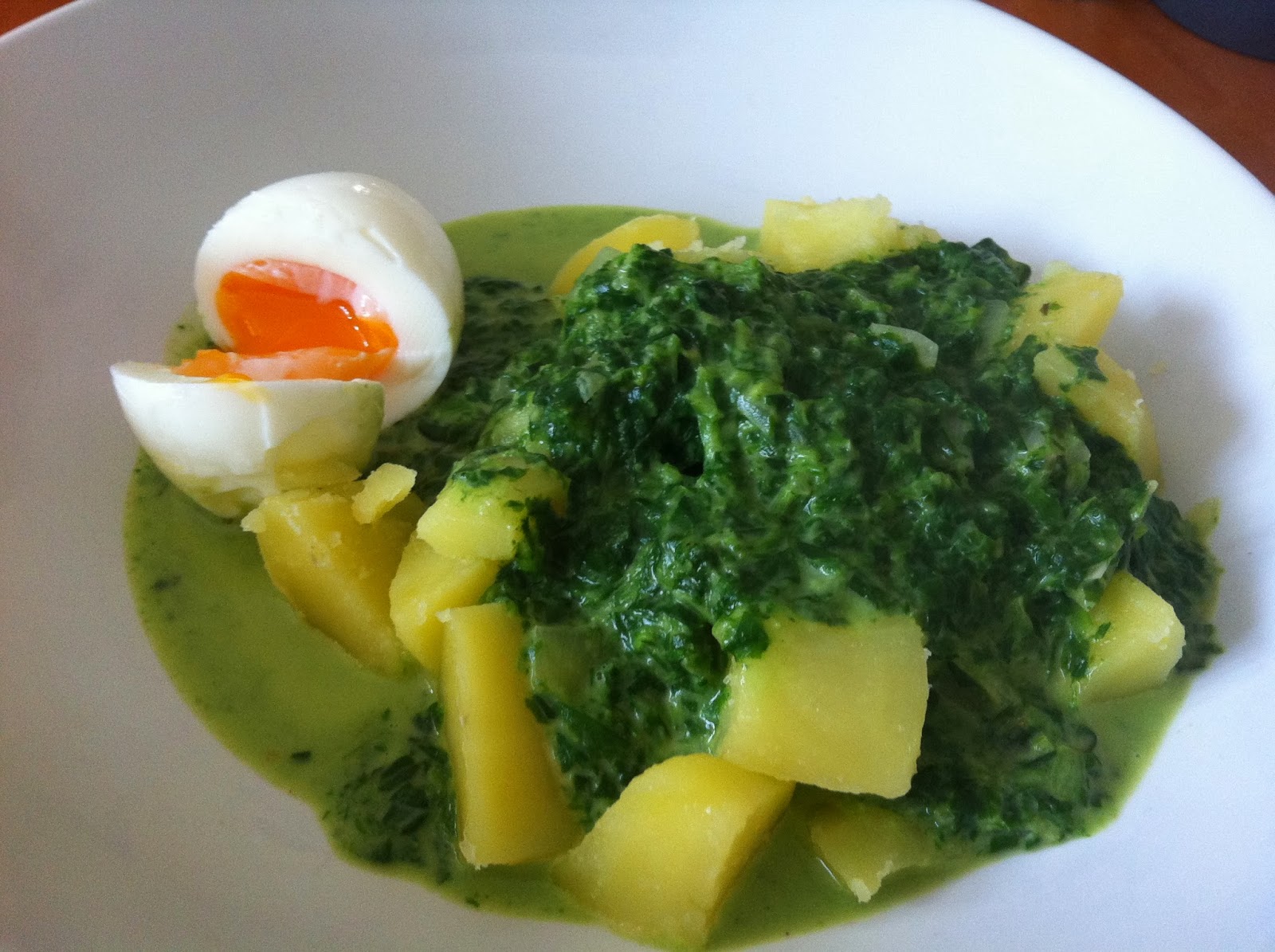 Es gibt mehrere Möglichkeiten mit dem Ei. Ich kenne es von klein auf, dass es weichgekochte Eier dazu gibt. Bei meiner Tante gab es immer Rührei dazu. Was ich auch sehr gerne mag: Die Eier hart kochen, klein würfeln und direkt in den Spinat geben. Zur Not kann man das Ei auch ganz weglassen *g*