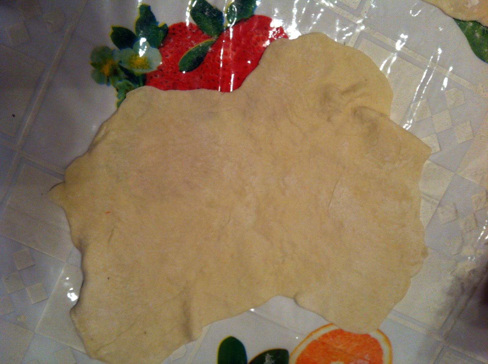 Hier habe ich noch ein Foto von den ausgerollten Teigfladen. Ich habe sie mit der Hand platt gedrückt und dann mit einem Nudelholz richtig flach gerollt. Erstaunlicherweise geht das relativ gut.