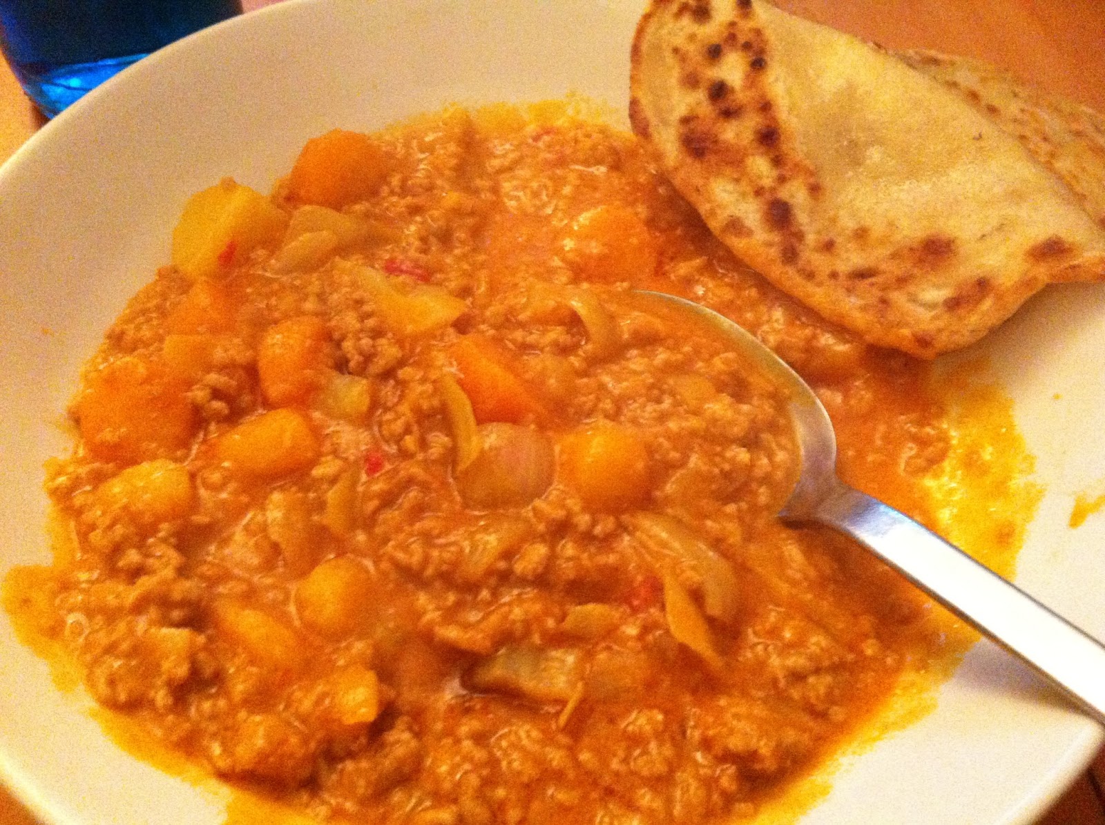 Die geschnittenen Möhren, Kartoffeln, Weißkohl, Zwiebeln und die Chilis (entkernt und in kleine Würfel geschnitten) dazugeben und mit Wasser auffüllen, bis alles eben bedeckt ist. Kochen bis das Gemüse gar aber noch knackig ist (ca. 20 Minuten).