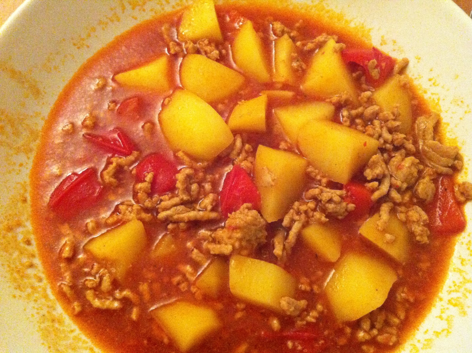 Das Hackfleisch in Öl anbraten und pfeffern und salzen. Die geschälten, in Würfel geschnittenen Kartoffeln dazugeben und für 5 Minuten mit geschlossenem Deckel garen lassen. Dann die Gemüsebrühe dazu geben, zum Kochen bringen und 5 Minuten kochen lassen.