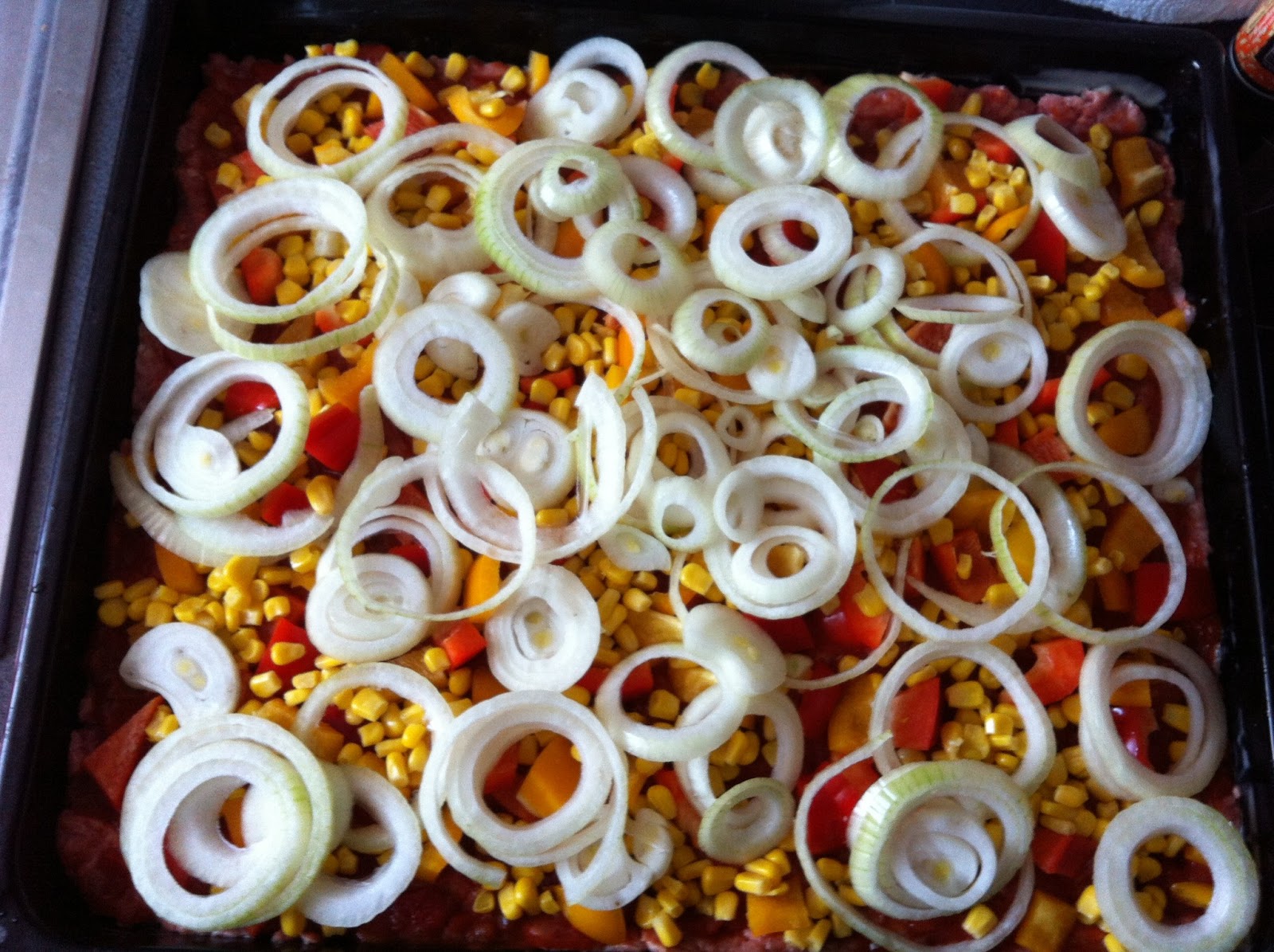 Die Paprikas klein schneiden, die Zwiebel in Ringe schneiden und auf der Pizza verteilen. Normal gehören noch Dosentomaten drauf, die habe ich diesmal weggelassen. Die Reihenfolge ist: