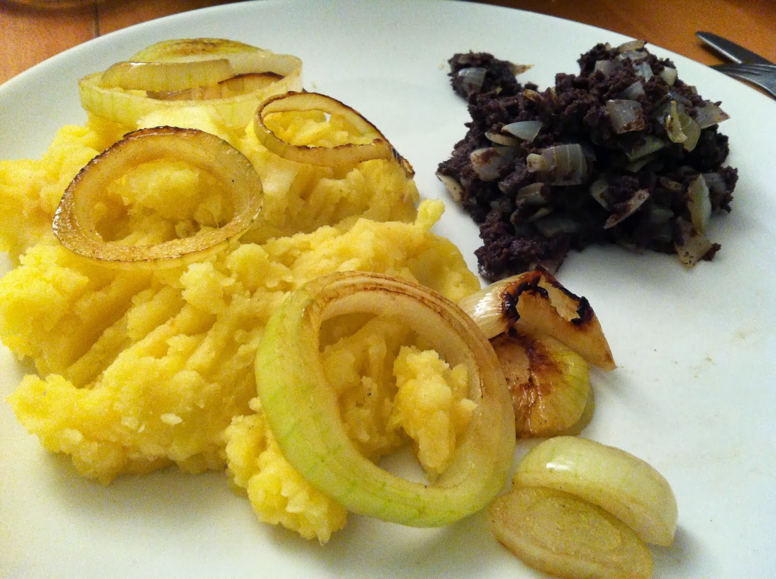 Dazu je nach Geschmack entweder Rostbratwürstchen oder gebratene Blutwurstscheiben. Für mich habe ich zusätzlich noch – ironischerweise – Tote Oma gemacht.