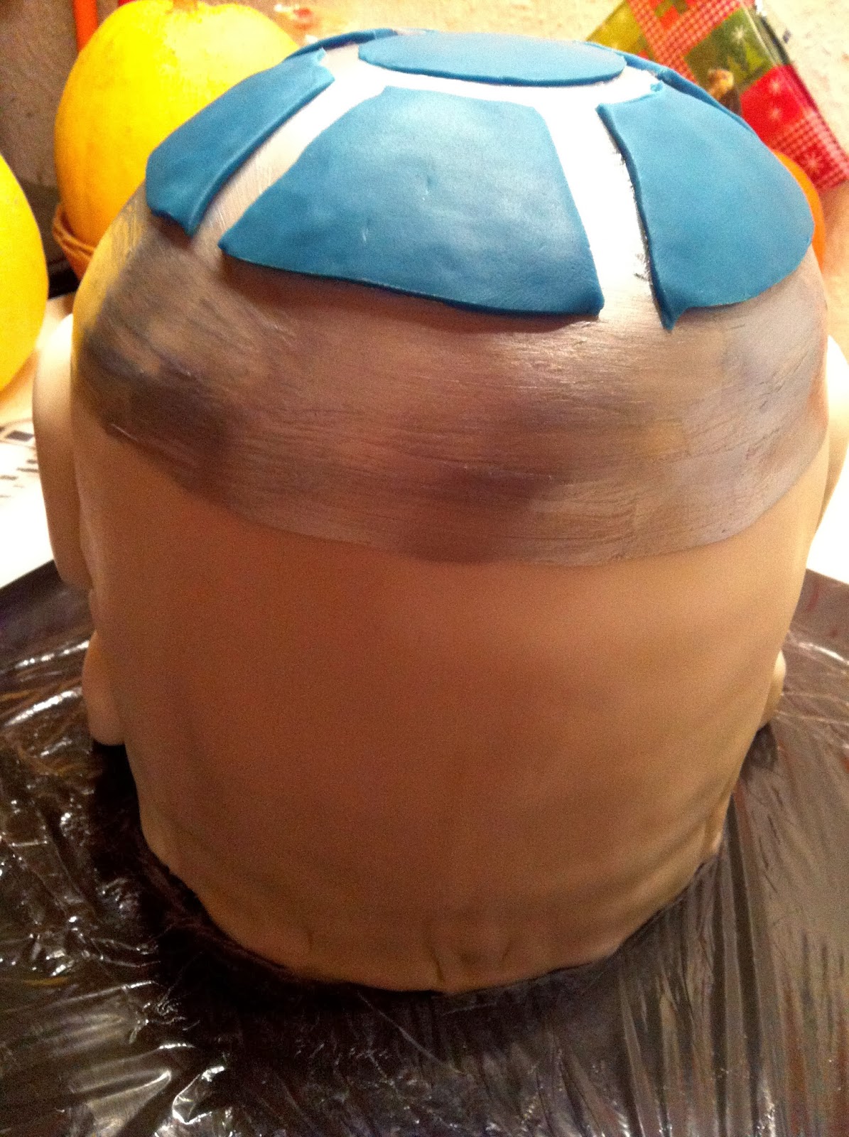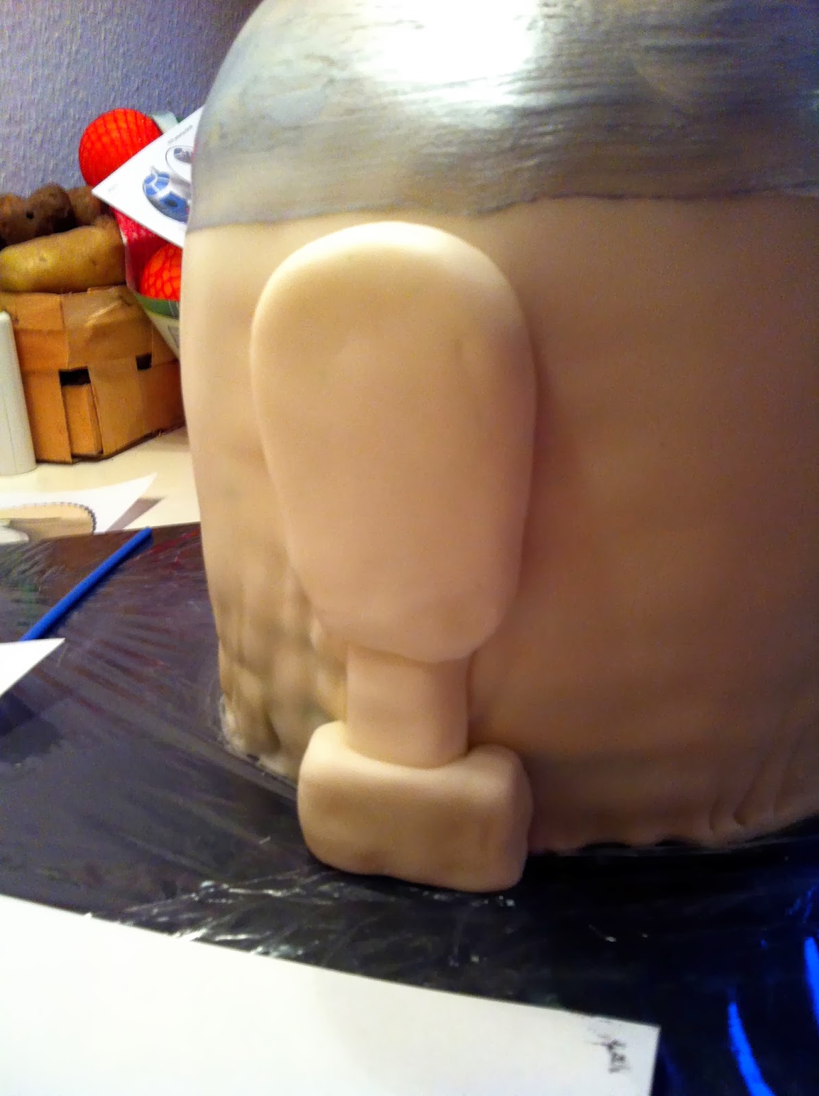 Das passiert halt, wenn man alle Farben mischt XD Nun habe ich den Kuchen komplett mit weißer Ganache umhüllt und noch einmal auf dem Balkon durchkühlen lassen. Danach ging es los mit dem Fondant. Ich hatte mir eine Menge Bilder ausgedruckt von R2D2 – von vorn, von hinten, von oben… Außerdem extra silber Farbe bestellt, damit ich einfacher arbeiten kann (muss ja nur mit dem Pinsel aufgetragen werden). Ich lasse zum Herstellungsprozess am besten wieder Bilder sprechen: