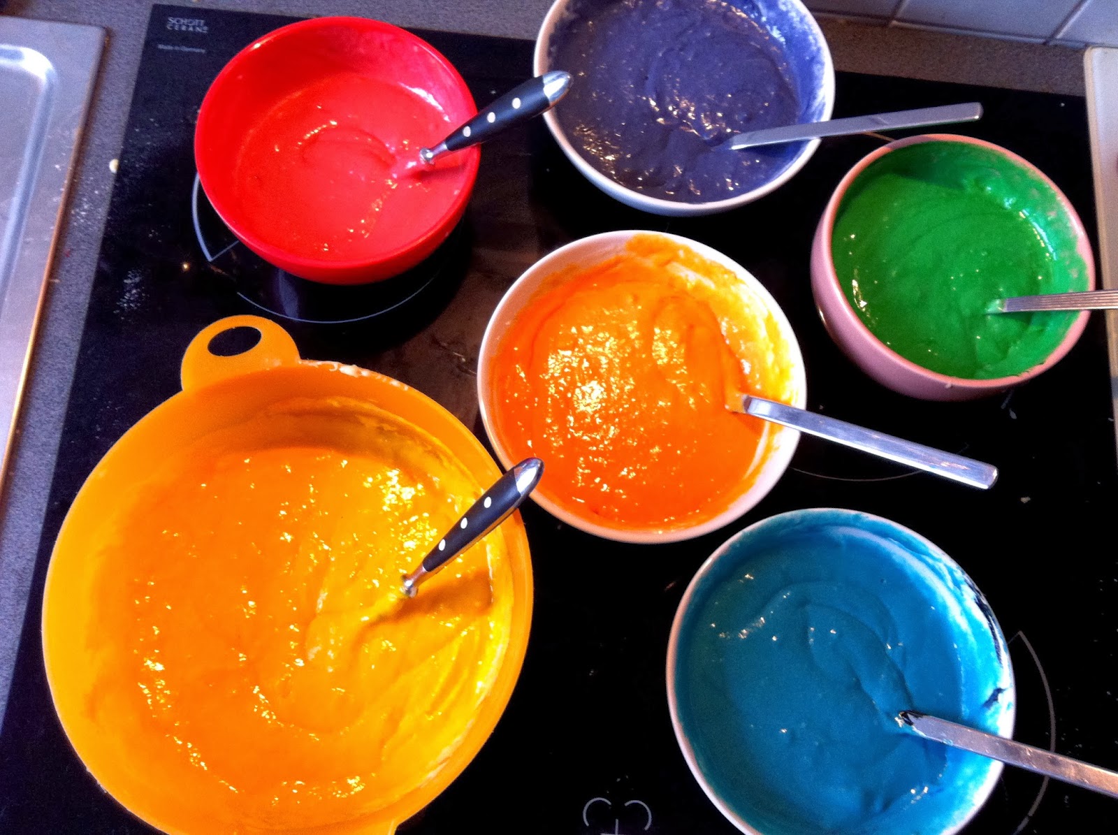 Dies sind die ersten 6 Farben, die ich gebacken habe. Den gelben habe ich zweimal gemacht, deshalb ist die Schüssel größer. Die letzten 3 Farben habe ich dann noch nachträglich gemacht, weil ich keine Schüsseln mehr hatte.