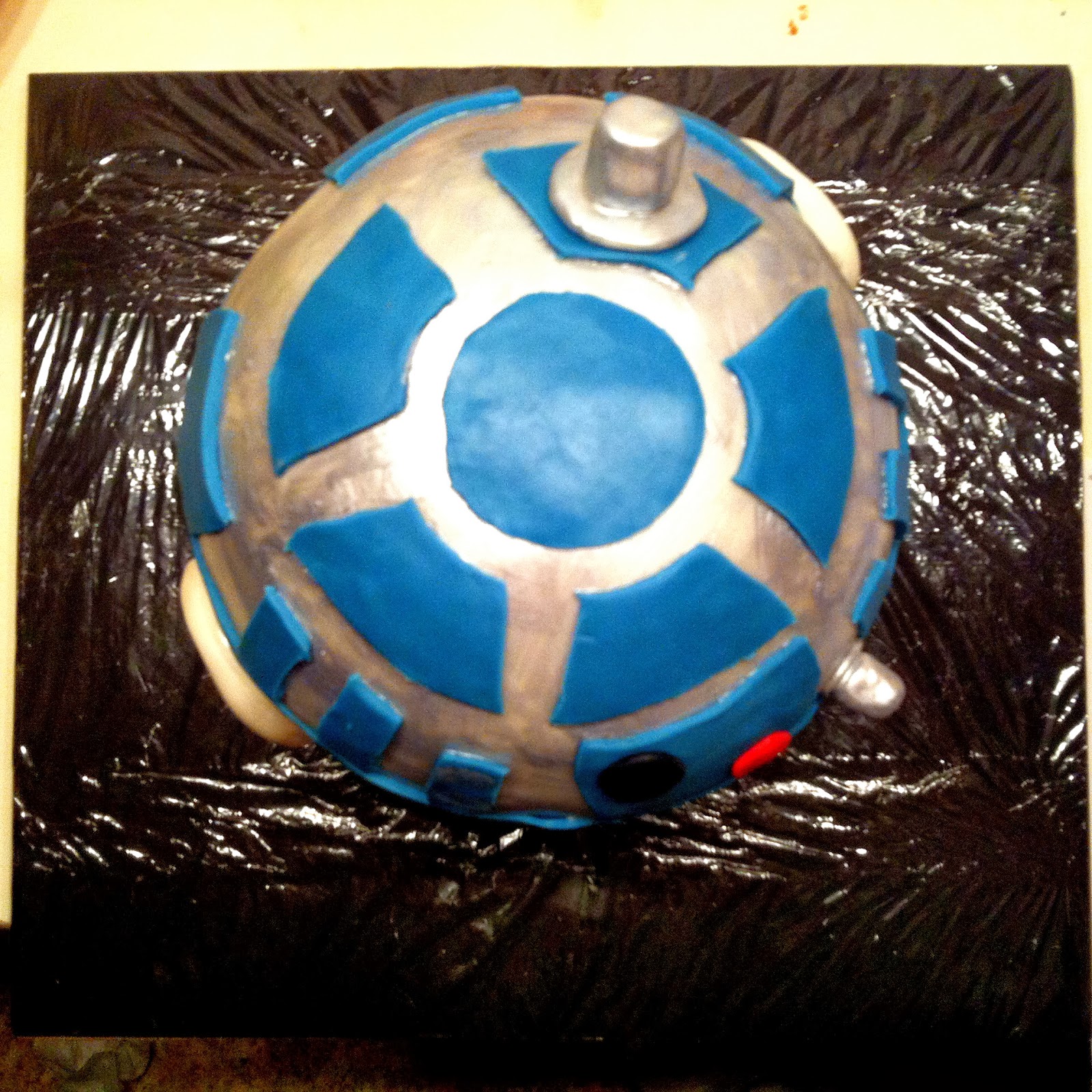 Das passiert halt, wenn man alle Farben mischt XD Nun habe ich den Kuchen komplett mit weißer Ganache umhüllt und noch einmal auf dem Balkon durchkühlen lassen. Danach ging es los mit dem Fondant. Ich hatte mir eine Menge Bilder ausgedruckt von R2D2 – von vorn, von hinten, von oben… Außerdem extra silber Farbe bestellt, damit ich einfacher arbeiten kann (muss ja nur mit dem Pinsel aufgetragen werden). Ich lasse zum Herstellungsprozess am besten wieder Bilder sprechen: