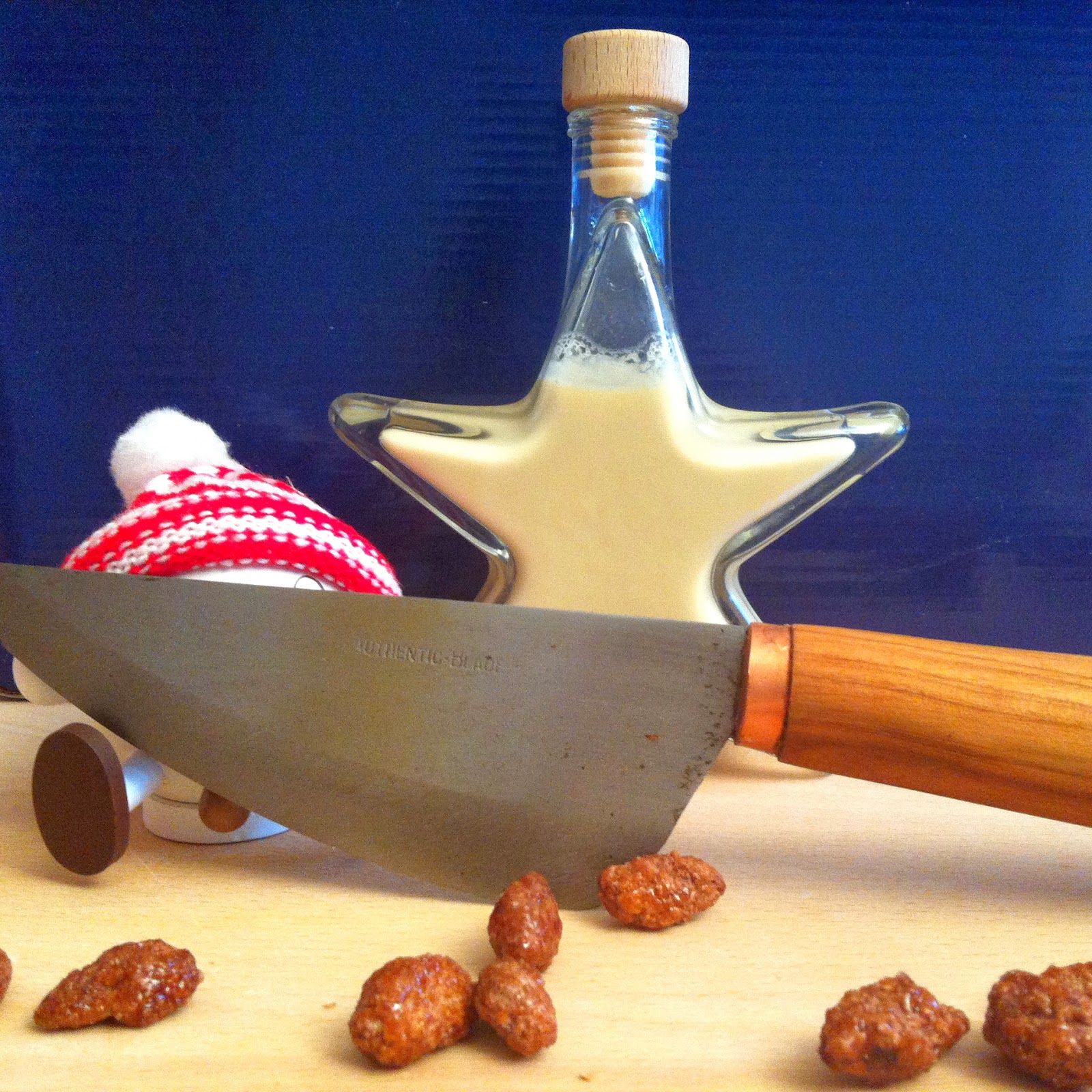 Im Hintergrund sieht man das Endergebnis – einen wahnsinnig leckeren Likör mit weißer Schokolade, Sahne und Amaretto. Für mich hatte ich eine alkoholfreie Version gemacht, leider war die viel zu süß (den Puderzucker würde ich beim nächsten Mal weg lassen). Meine Familie hat die ersten zwei Probefläschchen in Rekordzeit leer getrunken, die neu angesetzte Flasche steht noch im Kühlschrank und wird (wahrscheinlich) heute vernichtet – nur nicht von mir *seufz*.