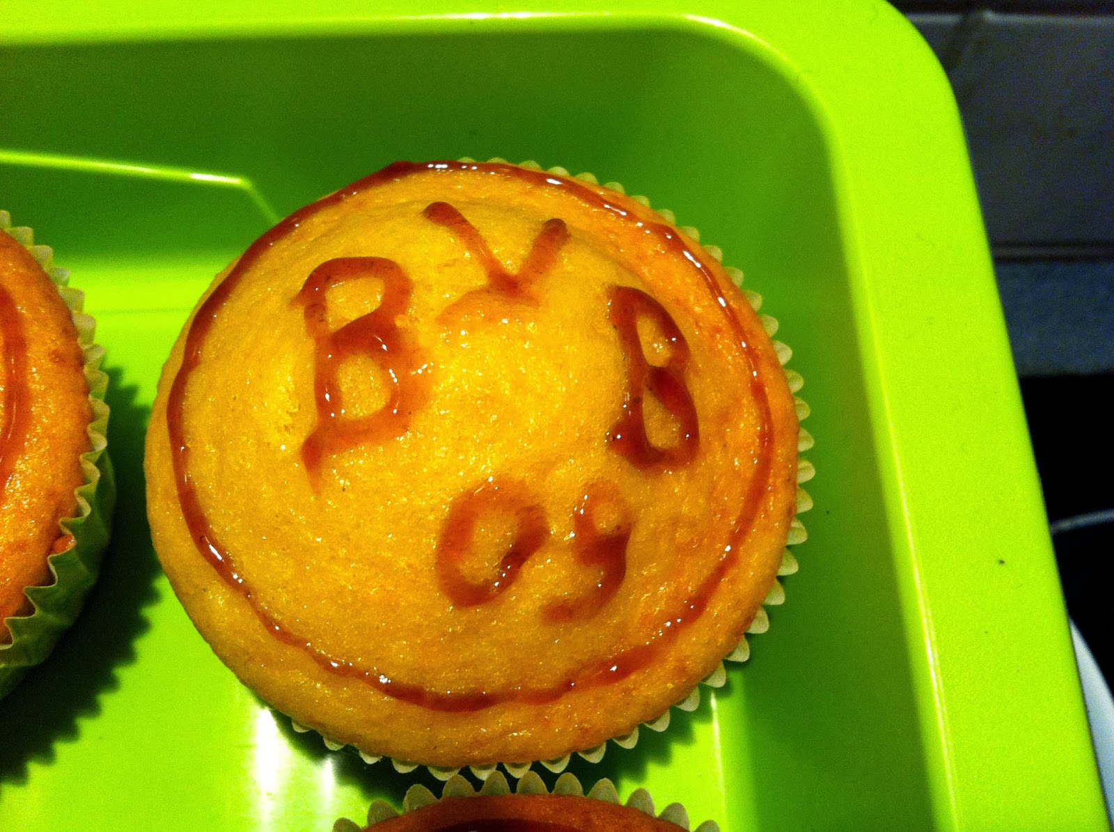 Diese Muffins bestehen aus einem Grundrezept für die kleinen Kuchen. Zusätzlich habe ich noch mit gelber Lebensmittelfarbe nachgeholfen. Eigentlich wollten wir schwarze Zuckerglasur kaufen, aber es gab leider nur braun und rot.. Als ich alle 12 Muffins beschriftet hatte, tat mir die Hand weh. Der gleichmäßige Druck der benötigt wird um zu schreiben, sollte nicht unterschätzt werden ;).
