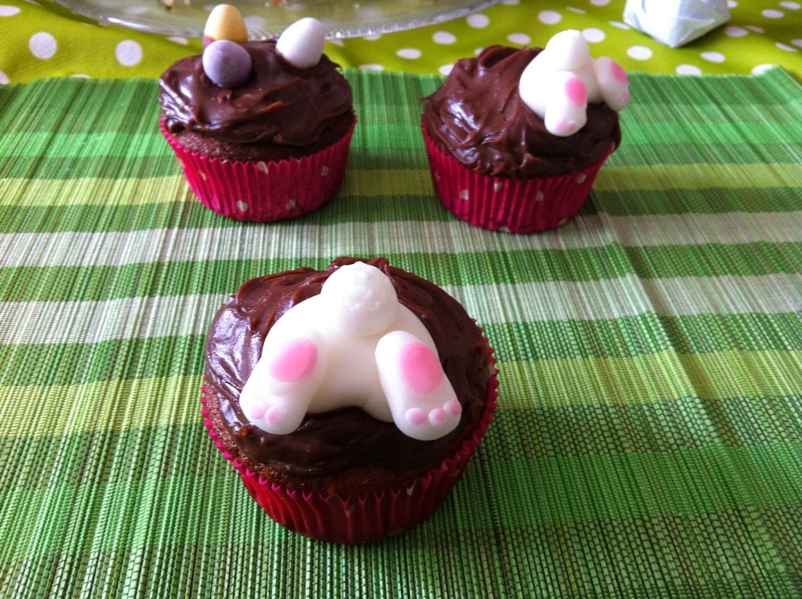 Die Haselnussmuffins habe ich dann mit der Ganache bestrichen und die Hasenpopops bzw. die Eier reingesteckt. Bis zum tatsächlichen Essen war die Ganache dann wieder fest und die Popos sind nicht verrutscht. Für einen noch besseren Effekt würde ich noch Kakaopulver auf die Ganache streuen (habe ich leider vergessen :/ ).