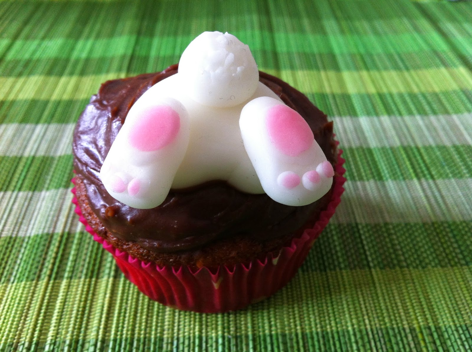 Ich habe 6 Muffins mit Hasenpopos gemacht und 6 mit Schokoeiern 🙂 Einfach weißes Fondant in „Po-Form“ bringen, eine weiße Kugel rollen und mit einer Schere mehrmals oberflächig einschneiden. Dann zwei Kugeln länglich formen für die Pfoten, 3 kleine Kugeln in weiß auf die Pfote setzen, auf die weißen Kugeln kleinere in rosa setzen und alles flach arbeiten. Eine größere weiße Kugel und entsprechend rosa als Hacke einarbeiten.