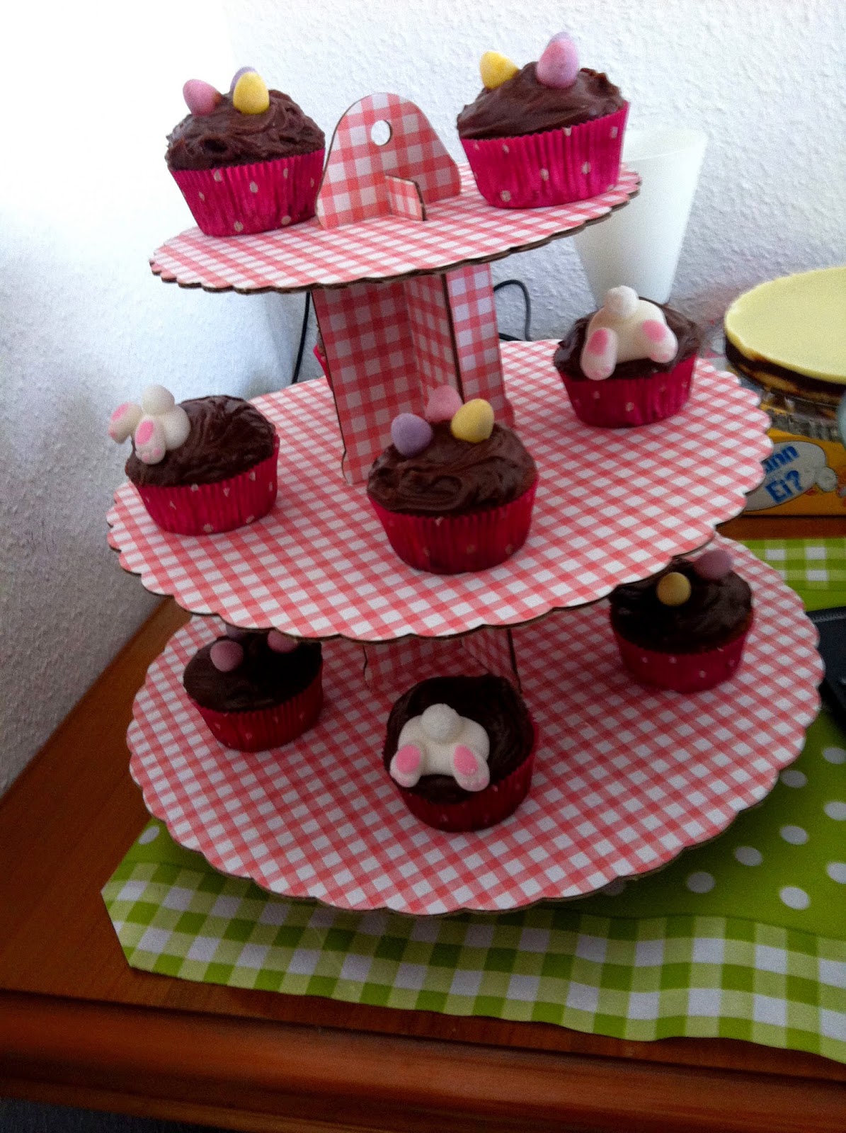Die Haselnussmuffins habe ich dann mit der Ganache bestrichen und die Hasenpopops bzw. die Eier reingesteckt. Bis zum tatsächlichen Essen war die Ganache dann wieder fest und die Popos sind nicht verrutscht. Für einen noch besseren Effekt würde ich noch Kakaopulver auf die Ganache streuen (habe ich leider vergessen :/ ).