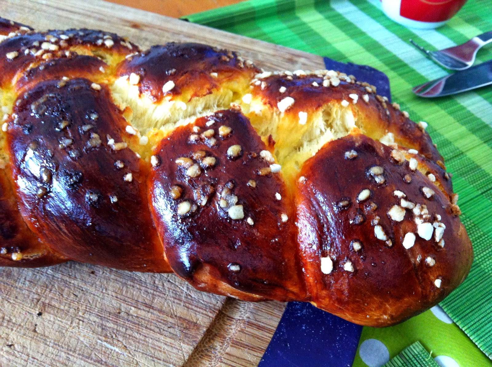 Den Zopf mit dem gekühlten Ei bestreichen, den Hagelzucker drüber streuen und im vorgeheizten Backofen bei 200 Grad auf der 2. Schiene von unten 25 Minuten backen. Die letzten 10 Minuten eventuell mit Alufolie abdecken.