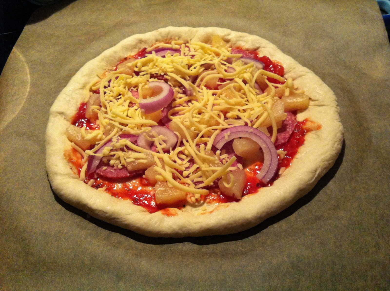 Belegt werden kann die Pizza ganz nach Wahl, zum Beispiel mit Tomatensauce, Salami, Mais, Kochschinken, Zwiebeln, Ananas, Käse… Ich mache immer einen Mozzarella-Käse-Rand, indem ich mir Mozzarella so aufschneide, dass ich dünne lange Streifen habe. Diese lege ich außen auf die Pizza und schlage dann den Rand um.