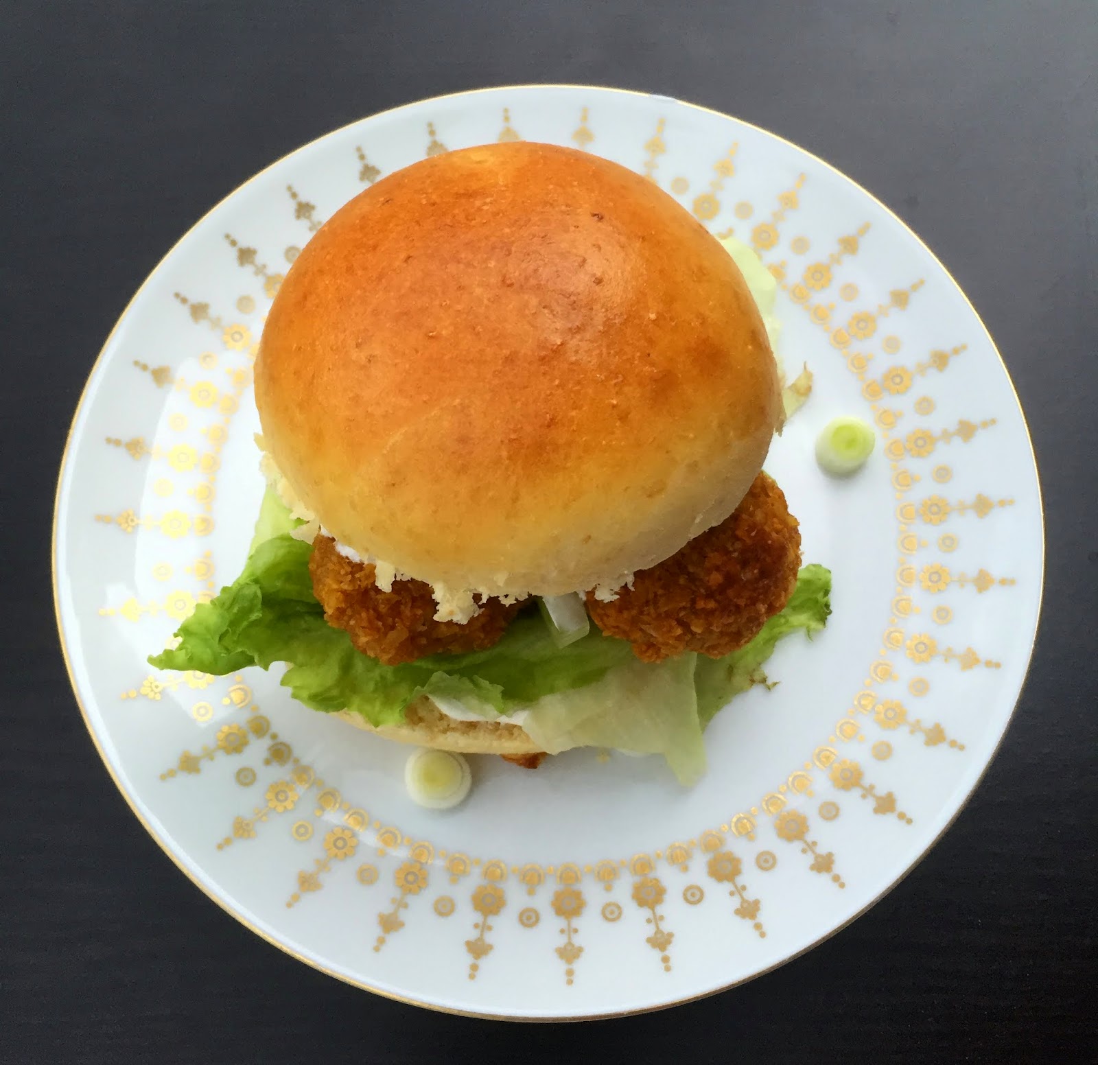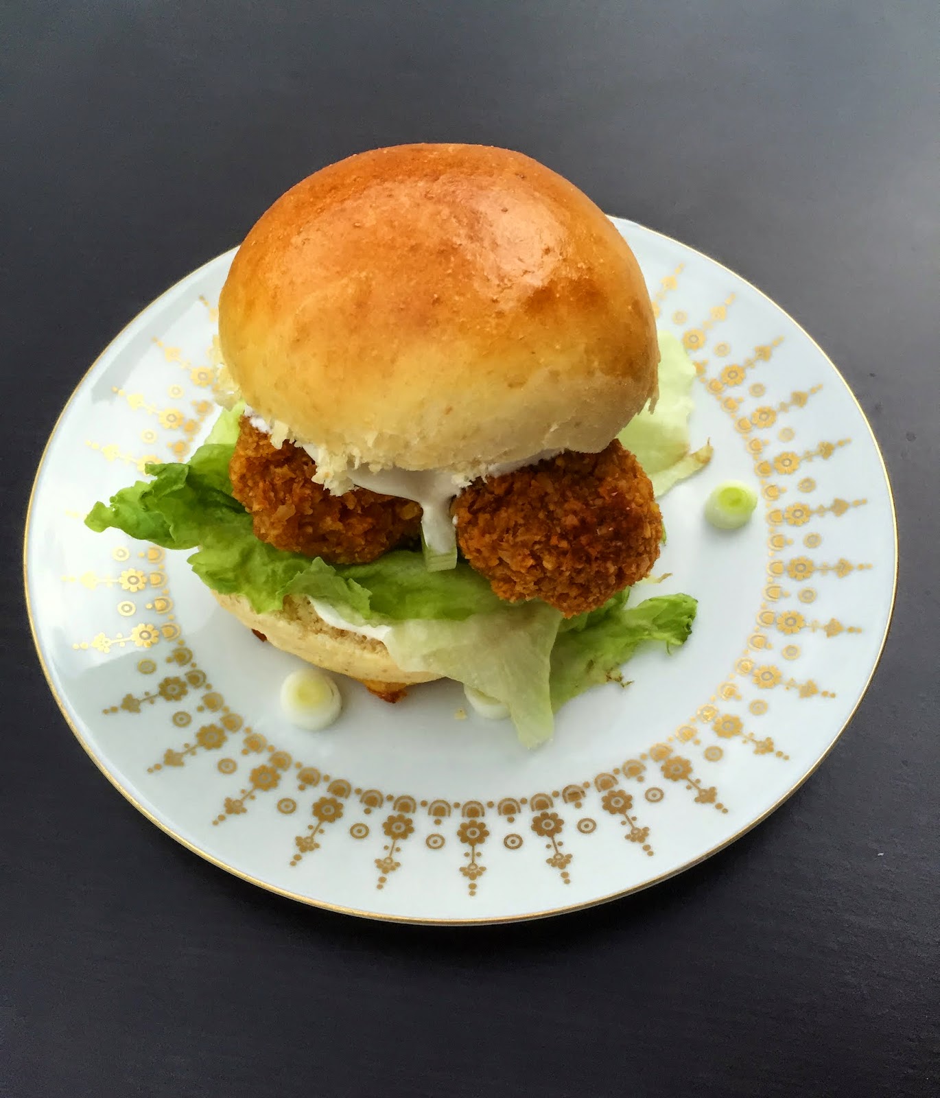 Endlich waren alle Bestandteile fertig und es konnte ans zusammenbauen gehen. Burger Bun aufschneiden, beide Seiten mit Knoblauchsauce bestreichen. Ein Salatblatt unten drauf legen, 3 Falafelbällchen auf das Blatt, ein paar Frühlingszwiebelröllchen und der Deckel kann drauf!