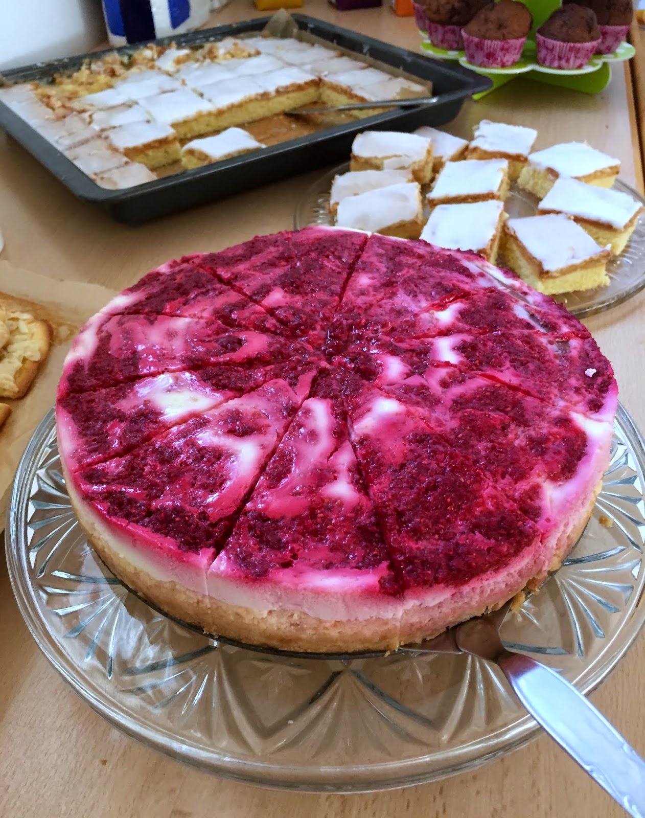 Das Chili habe ich genauso gekocht wie normalerweise, nur mit Sojageschnetzeltem statt Gehacktem. Nachdem es eine Nacht schön durchgezogen ist, hat es wunderbar geschmeckt 🙂 Die Baguettes habe ich selbst schon ein paar Mal gebacken, das Brötchenrezept hab ich vom Brotdoc und es ist gut <3 Der NY Cheesecake war gut, hat mich aber nicht umgehauen (vielleicht versuch ich mich demnächst einfach nochmal dran), der Pudding-Keks-Kuchen ist völlig in die Hose gegangen, hat aber trotzdem geil geschmeckt. Was ich aber auf jeden Fall wieder backen werde, ist der Mandel-Butterkuchen! Der war wirklich unglaublich lecker und deshalb gibt es jetzt auch direkt das Rezept: