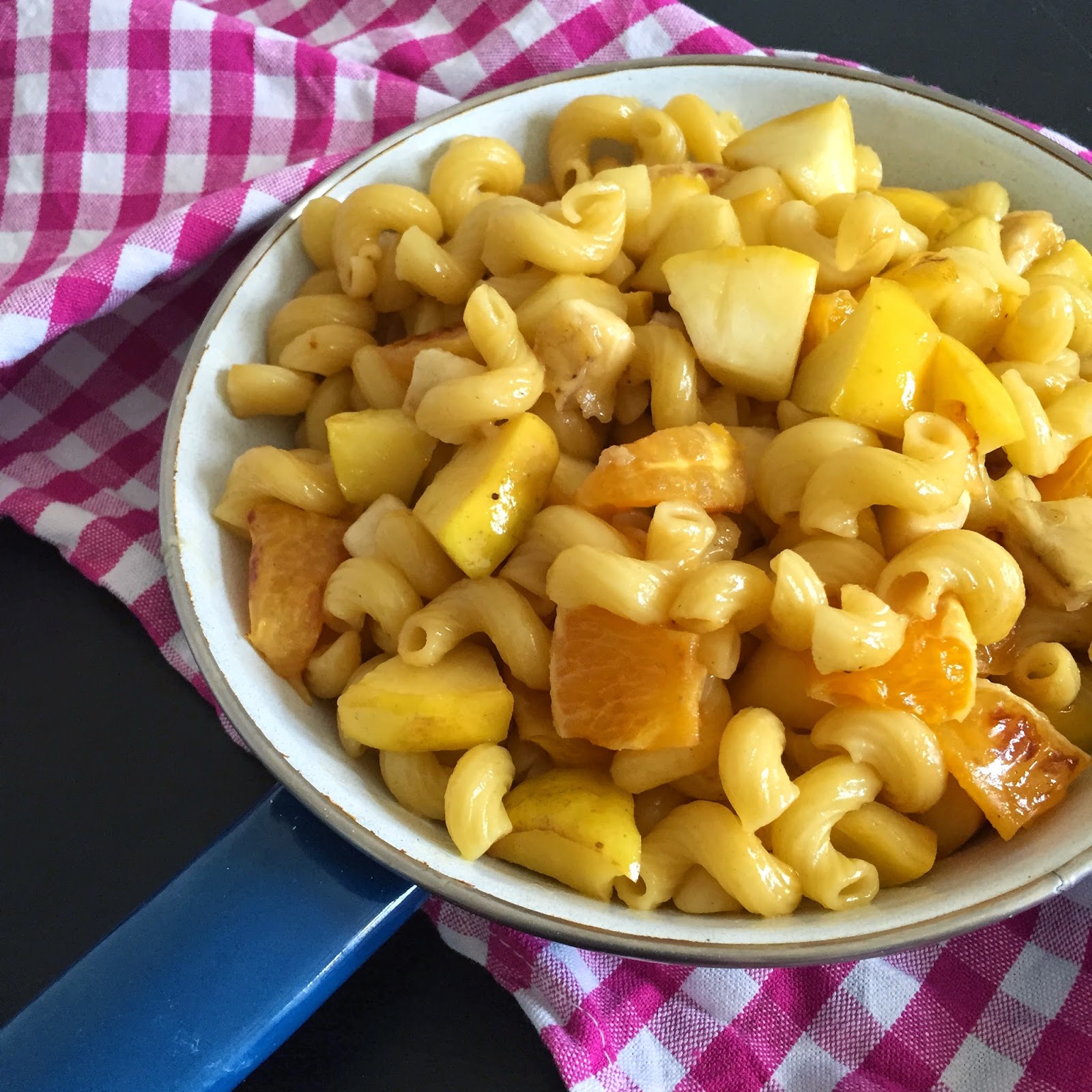 Diese süße Nudelpfanne gab es aus übrig gebliebenen Nudeln vom Vortag und angebratenem Obst von der Tafel. Unter anderem 3 Äpfeln, einer Banane und einer Apfelsine.
