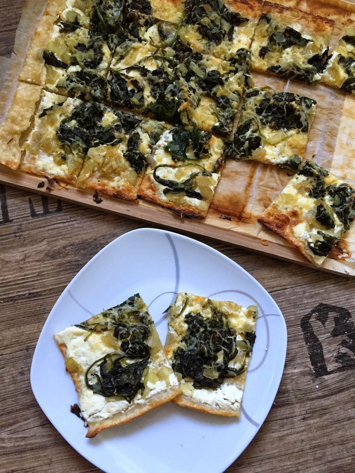 Ich habe allerdings nicht den gesamten Spinat zu Pesto verarbeitet (das wäre einfach zuviel gewesen). Den restlichen Spinat gab es dann als Flammkuchen. Den Teig hatte ich ebenfalls in der Tüte, darauf einen Becher Schmand verteilt, den mit Knoblauch und Zwiebel angedünsteten Spinat und etwas Käse – überbacken, fertig, lecker 🙂