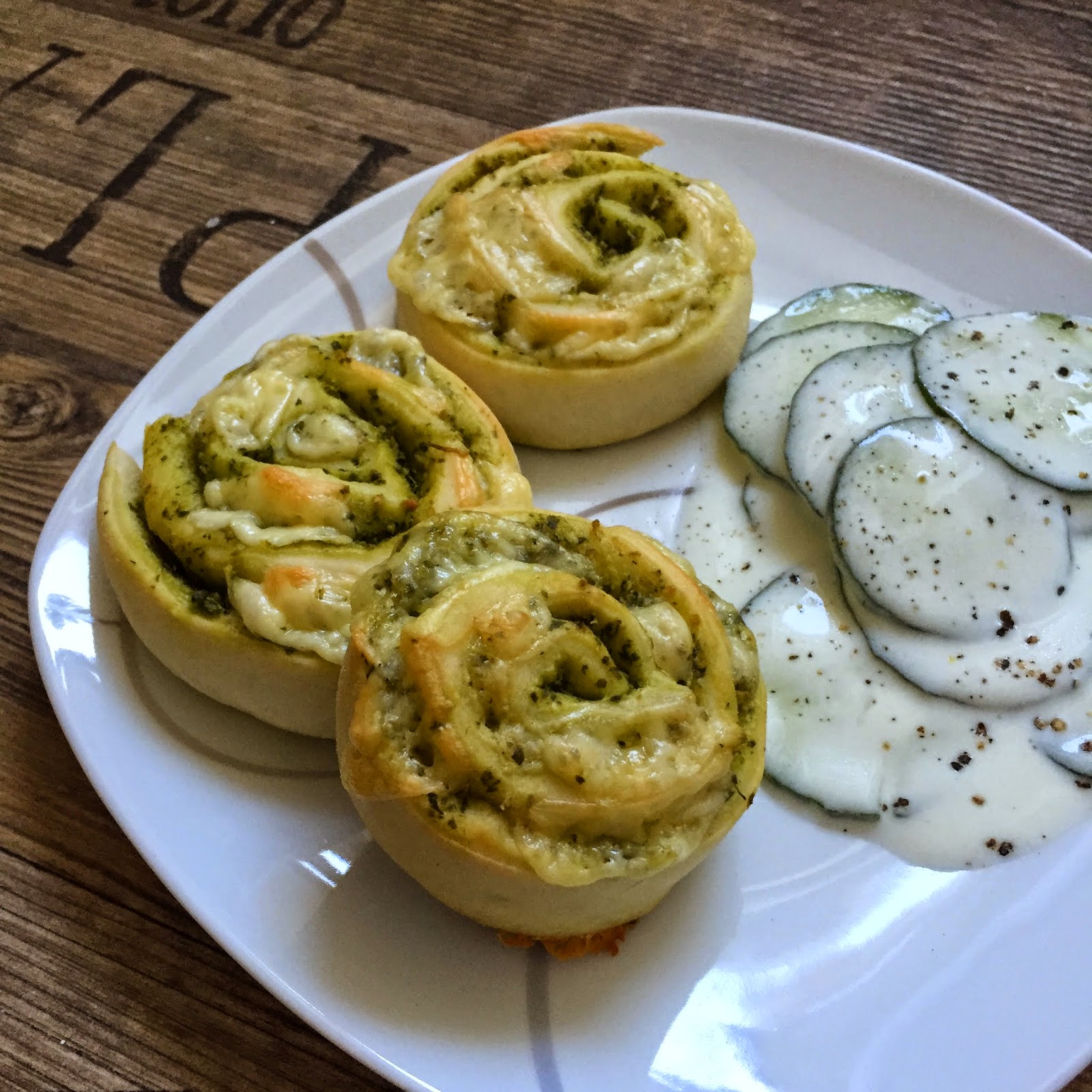 Das restliche Pesto gab es dann in Pestoschnecken. Dazu ein schneller Gurkensalat mit Dressing aus Joghurt, Balsamicoessig, Dillöl, Salz, Pfeffer und Zucker – fertig war das einfache aber megaleckere Abendessen.