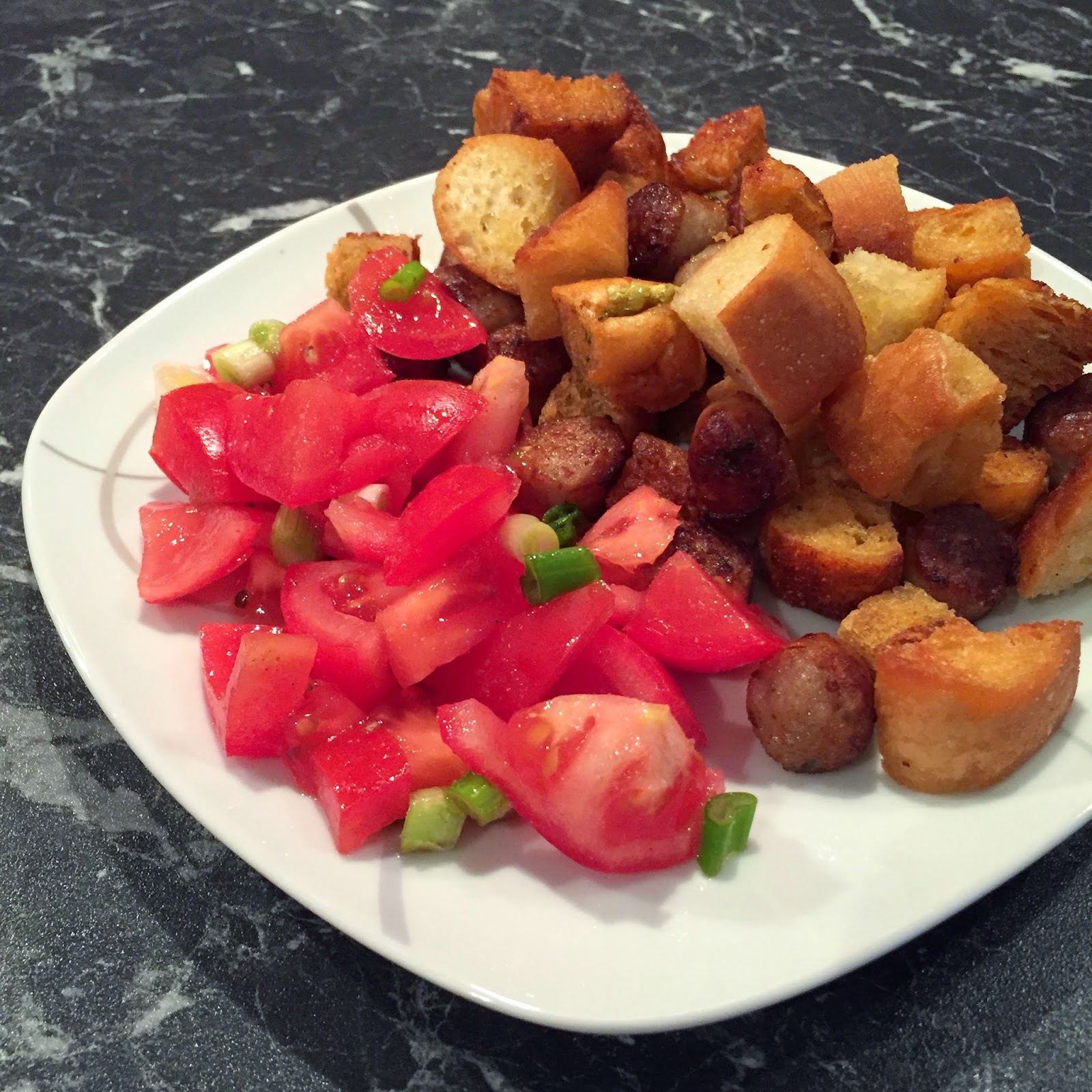 Die klein geschnittenen Brötchen habe ich angebraten, außerdem die klein geschnittenen Grillwürstchen. Dazu gab es Tomatensalat mit Frühlingszwiebeln. Sehr lecker war das, die angebratenen Brötchen werde ich wohl noch öfter machen, auch wenn sie doch recht kalorienintensiv sind…