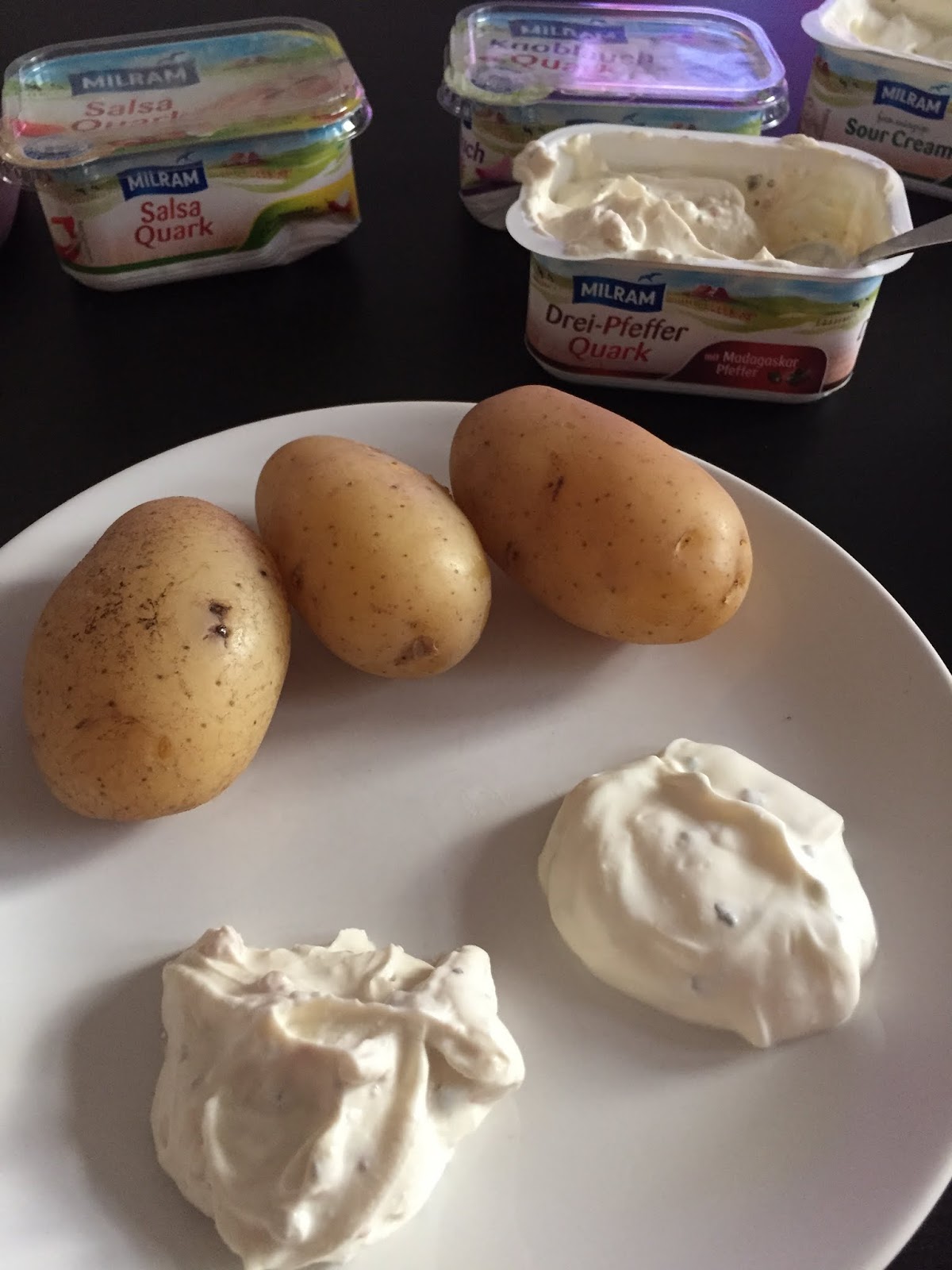Ich esse total gerne Pellkartoffeln – am liebsten ganz einfach mit ein bißchen Butter und Salz. Im Kühlschrank hatte ich aber noch soviele Quarks von Milram stehen, dass wir quasi Verkostung gemacht haben ^^ Mein Favorit – die Sour Creme. Durchgefallen sind Drei-Pfeffer und Knoblauch. Gut zu wissen wenn man vorm Regal steht und überlegt ob man Fertigdips zum Grillen mitbringen soll ^^
