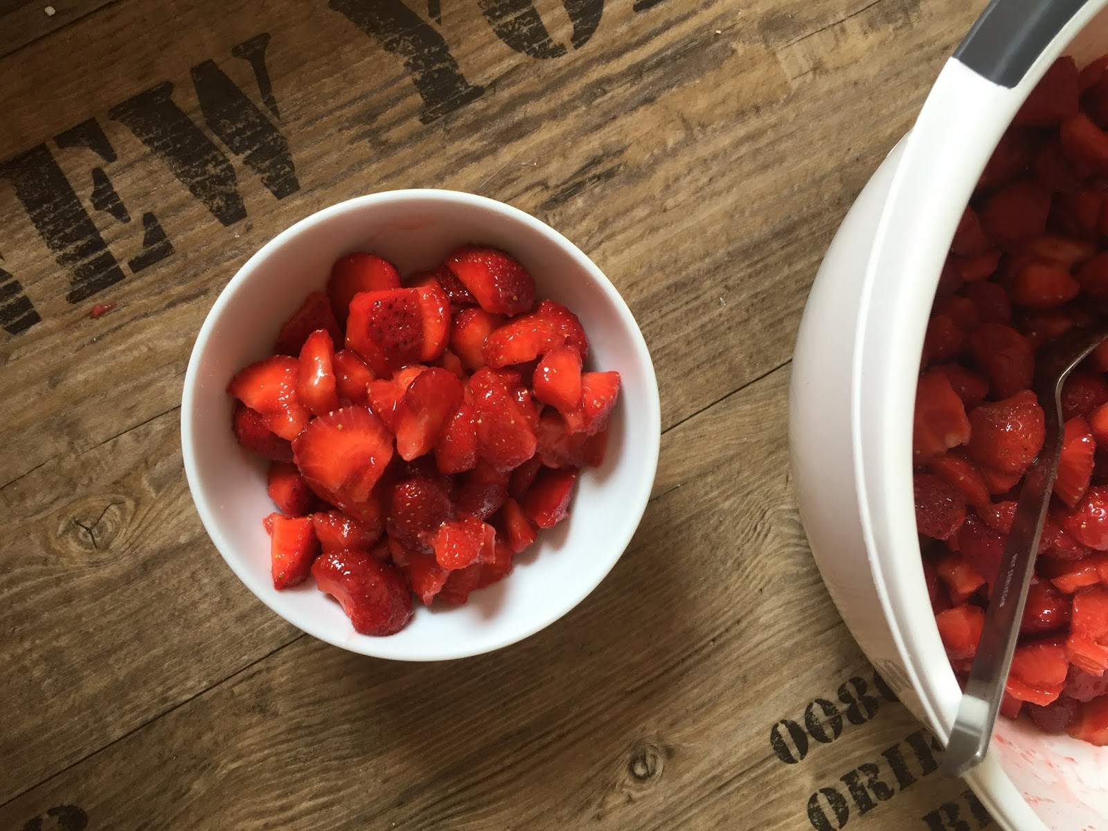 Die Erdbeeren durfte ich übrigens nicht verarbeiten. Also keine Marmelade, Grütze, Kuchen oder sonstwas – nein mein Freund wollte sie einfach gezuckert essen. So richtig zum überfressen viel hatten wir am Ende ^^ Wird wohl das einzige Mal sein diese Erdbeersaison, also sei es ihm gegönnt.
