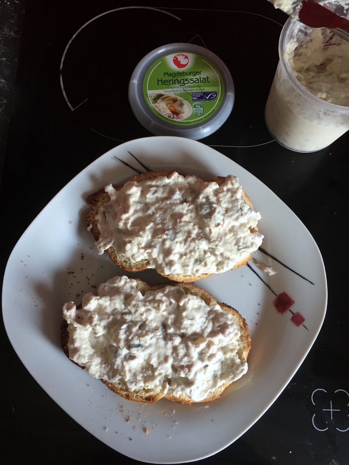 Am Tafeltag abends gab es für mich Brötchen mit Heringssalat. Gerade bei Fisch bin ich sehr sehr vorsichtig – auch wenn ich ihn normal im Laden gekauft habe. Aber ich hab dran gerochen, ich hab ihn probiert und er schmeckte super. Allgemein fand ich den wirklich lecker. Am nächsten Tag habe ich mir zum Frühstück dann auch nochmal Brötchen aufgebacken und mit richtig dick Heringssalat bestrichen. Wann hat man schon mal die Möglichkeit so richtig zu übertreiben mit Aufstrich? ^^
