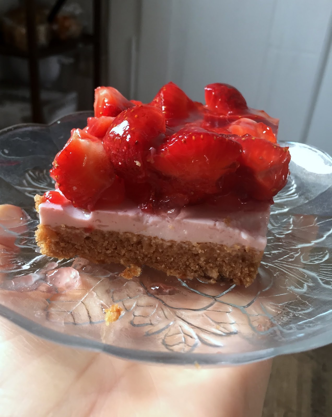 Die Schnitten sind bei uns übrigens kaum süß gewesen, weil die Erdbeeren recht sauer waren und ich auf zusätzliches süßen verzichtet habe. Da es aber SEHR warm war als wir die Schnitten gegessen haben, kam uns das gerade recht 😉 Das kann ja glücklicherweise jeder selbst entscheiden ob noch extra Zucker dazu kommt oder nicht.