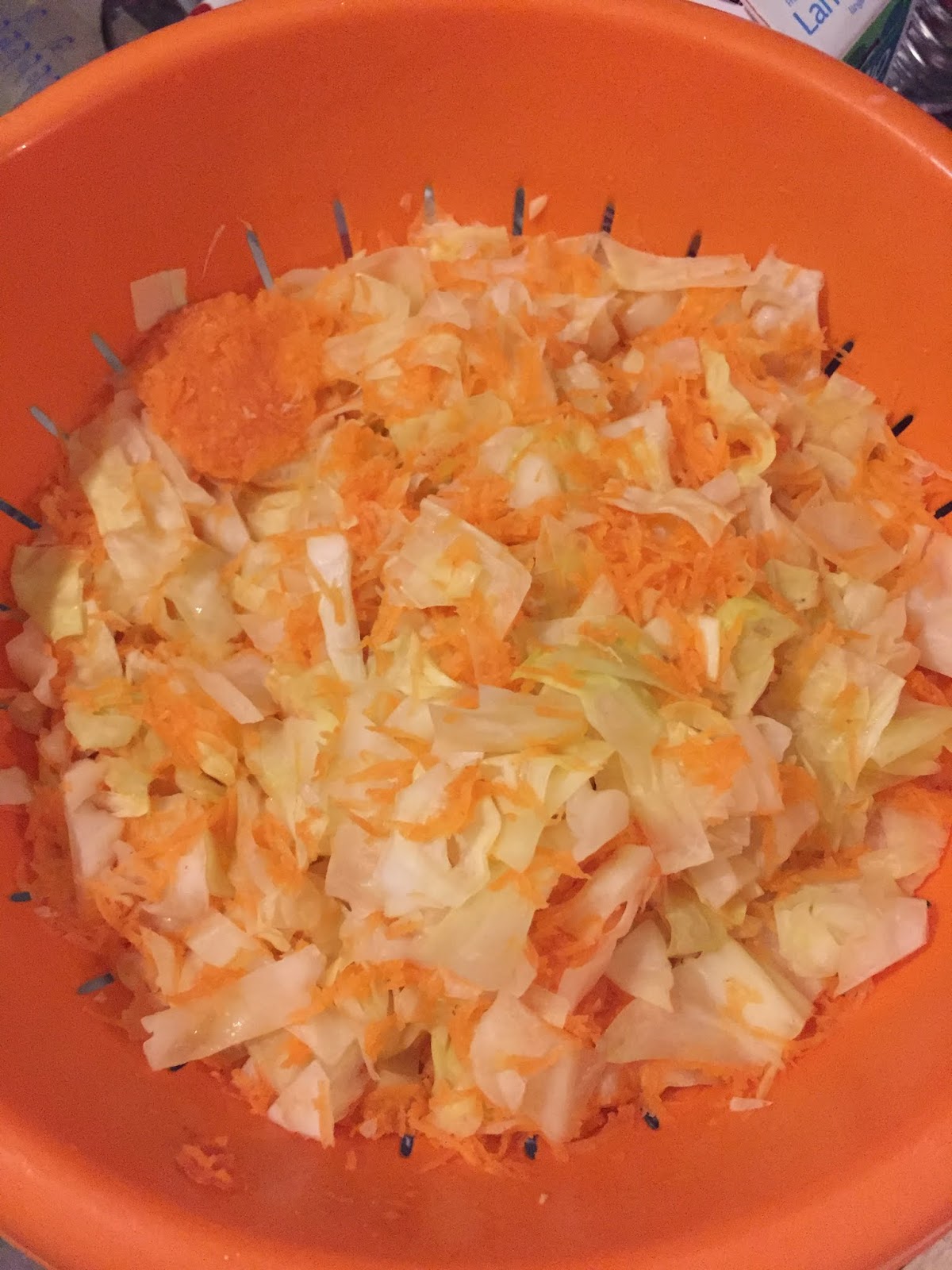 Das Gemüse waschen und putzen. Die Möhren grob raspeln. Den Spitzkohl vierteln, den Strunk entfernen und dann in Streifen schneiden. Möhrenraspel und Spitzkohlstreifen in Salzwasser ca. 2 Minuten blanchieren und dann gut abtropfen lassen. Die Knoblauchzehe pellen und klein würfeln. Öl in einer Pfanne erhitzen, die Knoblauchwürfel und das blanchierte Gemüse zugeben, den Salbei unterrühren und alles mit Salz, Pfeffer und Muskat abschmecken. 5-10 Minuten auf niedriger Stufe dünsten.