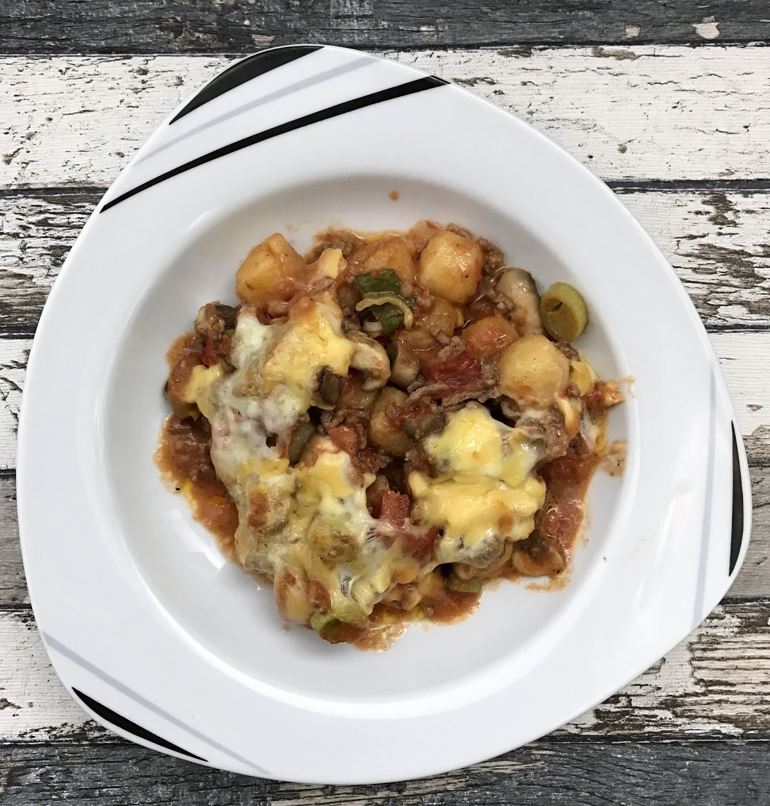 Wenn ich Einkaufen gehe, dann zieht mich die „reduziert-Kiste bzw. Ecke“ immer magisch an. Ich weiß in jedem Laden, den ich regelmäßig besuche, wo die zu finden ist. Und wenn dann interessante Sachen drin liegen, werden die auch mitgenommen – egal ob sie in diesem Moment auf der Einkaufsliste stehen oder nicht. Letztens habe ich auf diese Weise um 50 % reduzierte Marken-Gnocchi ergattert. Die lagen nun im Kühlschrank und lachten mich an. Außerdem hatte ich sicherheitshalber etwas mehr Hack gekauft und musste das nun dringend verarbeiten. Tja und weil ich im Netz nichts gefunden habe, was zu meinen Zutaten genau passte UND mich ansprach, hab ich einfach selbst gebastelt.